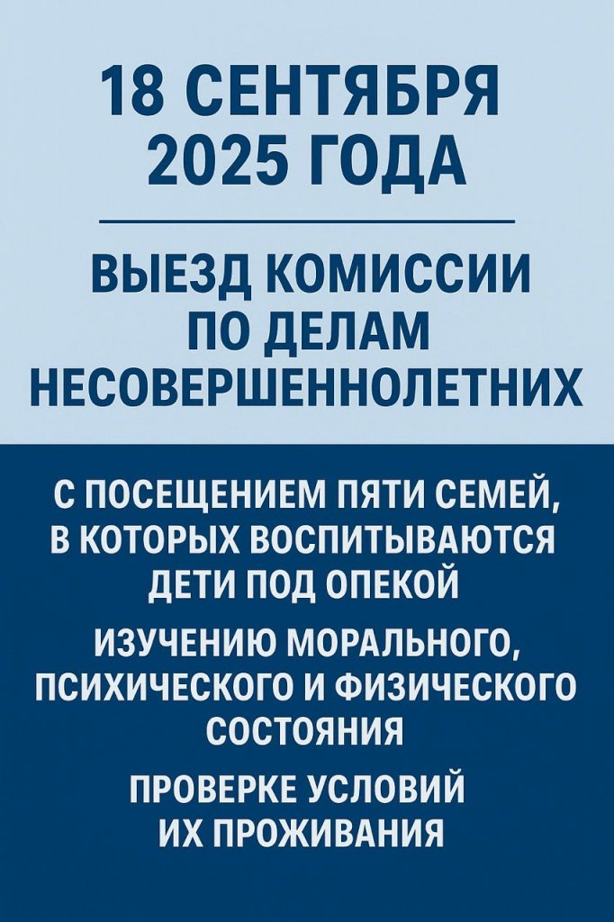 29.09.2025КӘМІЛЕТКЕ ТОЛМАҒАНДАР ІСІ ЖӨНІНДНГІ КОМИССИЯНЫҢ ШЫҒУЫ2025 жылғы 18 қыркүйекте Бурабай ауданы әкімінің орынбасары төрағалық еткен кәмелетке толмағандар ісі жөніндегі комиссия мүшелері қамқоршылықтағы балалар тәрбиеленіп жатқан бес отбасына барып, тексеріс жүргізді.